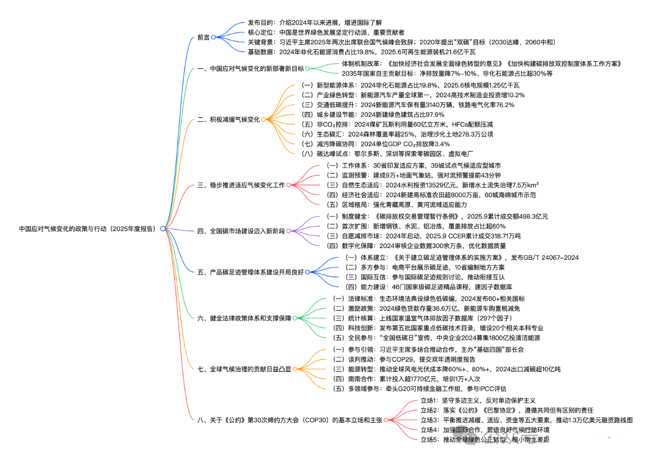 生态环境部于2025年10月发布《中国应对气候变化的政策与行动(2025 年度报告)》,系统阐述 2024 年以来中国应对气候变化的进展:明确2035 年国家自主贡献目标(全经济范围温室气体净排放量比峰值下降 7%-10%、非化石能源消费占比超 30% 等),在积极减缓气候变化(新型能源体系建设,2025.6 可再生能源装机达 21.6 亿千瓦;产业、交通等领域低碳转型,2024年新能源汽车保有量 3140万辆)、稳步推进适应气候变化(监测预警体系完善、生态系统适应能力提升)、全国碳市场建设(首次扩围至电力、钢铁等4行业,覆盖排放占比超 60%)、产品碳足迹管理(建立核算标准体系)等方面成效显著,同时通过气候变化南南合作(累计投入超1770亿元)等行动引领全球气候治理,并提出《公约》第30次缔约方大会(COP30)的五大立场主张,彰显中国应对气候变化的坚定决心。