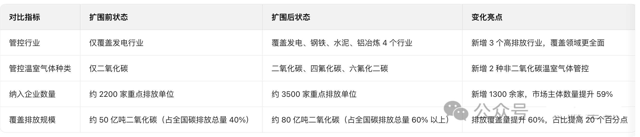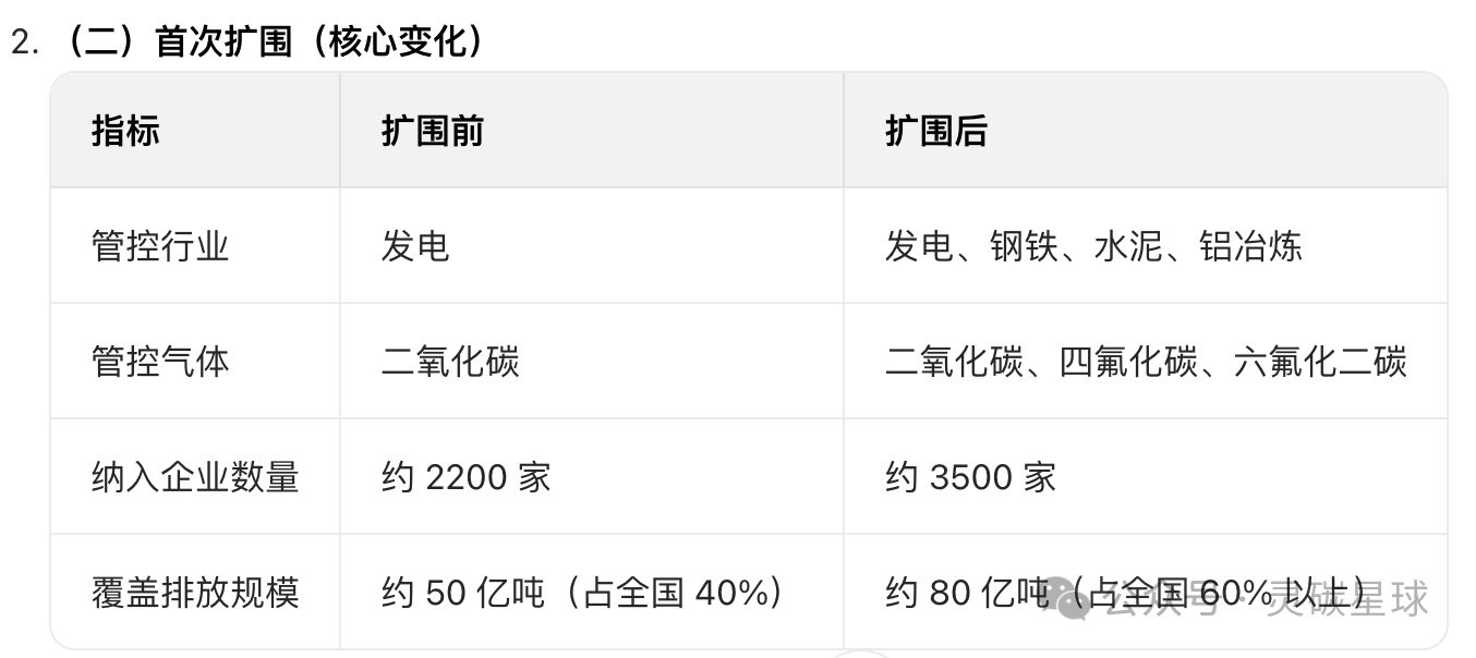 答案:全国碳排放权交易市场首次扩围(新增钢铁、水泥、铝冶炼行业)后,管控范围与覆盖规模实现大幅拓展,具体变化如下表所示: