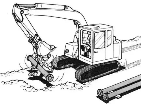 (2) 操作员必须拥有相应的从业资格。利用液压挖掘机铲斗处的吊钩将管道(约1.2t)吊到沟(深度4.7米)的下面,想要进行埋设管道作业。管道在下降途中,碰到了沟的横梁。缆绳慢慢地从吊钩脱离,管道滑落直接击中工作人员、造成死亡。(1) 不进行用途外的使用。