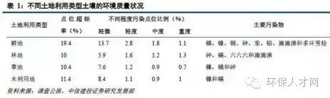 根据《全国土壤污染状况调查公报》显示,全国土壤总的超标率为16.1%,其中轻微、轻度、中度和重度污染点位比例分别为11.2%、2.3%、1.5%和1.1%。耕地土壤环境质量堪忧,工矿业废弃地土壤环境问题突出。工矿业、农业等人为活动以及土壤环境背景值高是造成土壤污染或超标的主要原因。