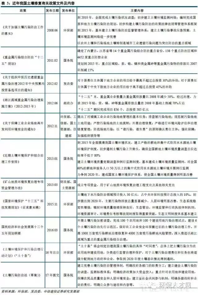 除了污染防治政策发布相对滞后以外,我国土壤修复政策体系也不够健全,“十二五”期间我国切实加大了污染场地修复标准体系建设的力度,发布了包括《场地环境调查技术导则》等污染场地5项技术标准,为各地开展场地环境状况调查、风险评估、修复治理提供技术指导和支持。2016年《农用地土壤环境质量标准》和《建设用地土壤污染风险筛选指导值》的第三次修订,取消了现行标准中的一级标准,不再规定全国统一的土壤环境背景值,而是依据土壤环境背景值开展土壤环境质量评价与管理。