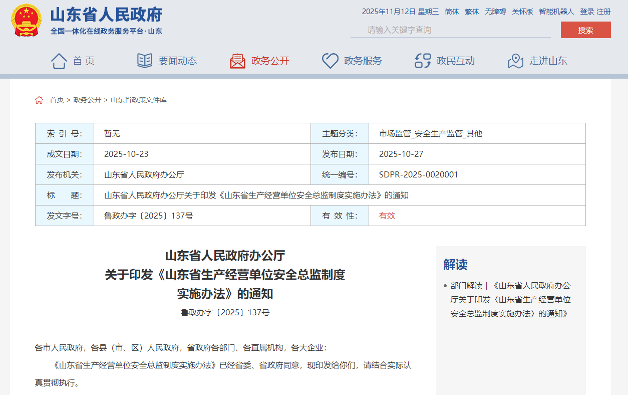 自2023年8月省政府办公厅印发《山东省生产经营单位安全总监制度实施办法(试行)》(鲁政办字〔2023〕116号)以来,全省8439家企业实现安全总监应配尽配,有力推动了生产经营单位安全生产主体责任落实,对于防范各类生产安全事故发生,促进全省安全生产形势持续稳定发挥了重要作用。《山东省生产经营单位安全总监制度实施办法(试行)》已于2025年9月30日到期失效。为继续实施安全总监制度,重新制定出台了《山东省生产经营单位安全总监制度实施办法》(以下简称《实施办法》)。
