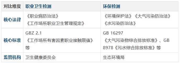 一句话总结:职业卫生检测盯 “员工吸进去的空气”,环保检测盯 “企业排出去的废气 / 废水”。