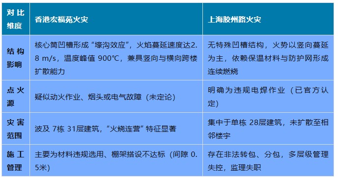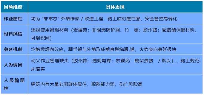 作为国内高层住宅施工火灾的典型案例,胶州路大火与宏福苑火灾存在诸多共性风险,其核心特征如下:
