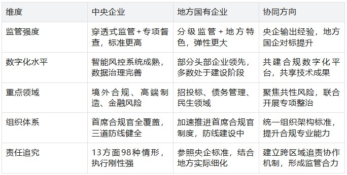 中央企业与地方国有企业在合规管理上存在明显差异,同时也有着广阔的协同空间,具体可从以下维度清晰区分: