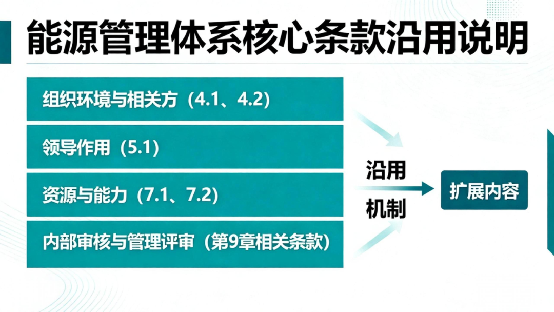 把这些内容放在一起看,可以得出一个比较清晰的结论:这些新增要求,并不是要企业再搭建一整套管理体系,而是在既有能源管理体系框架上,补充几块原本不属于能源管理范畴的管理模块。