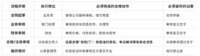 抓住最要害的一两个流程,先把它管死。 对大多数民企来说,“合同盖章”和“大额付款” 这两个流程是红线。你就参照上表,设计一个自己的简易流程,核心就是:没有合规审核签字,公章就不能盖,钱就不能付。把合规变成办事的一个必经步骤,而不是额外的负担。用流程管人,永远比人盯人更可靠。