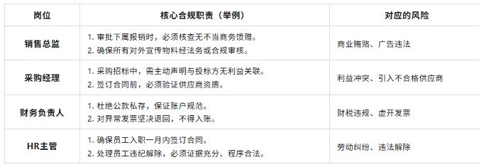 第二步(下周完成):把这些风险,分给业务、采购、财务、HR几个核心部门负责人,形成他们的《岗位合规职责清单》,签字确认。