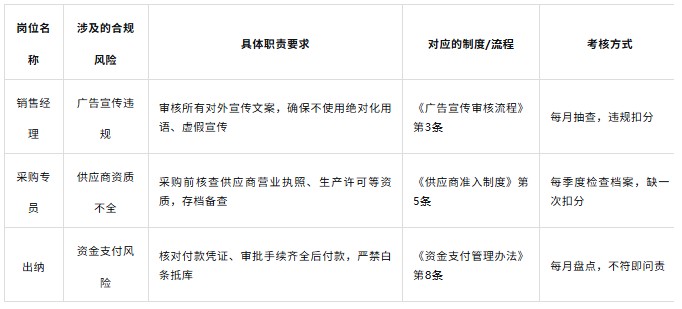 合规不是某个部门某个人的“专利”,而是每个岗位日常工作的一部分。第二张表的本质,就是把合规要求嵌进岗位里——让每个岗位都成为合规的执行者,而不是旁观者。