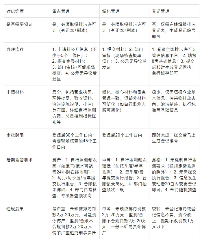 其实核心判断标准很简单:看企业污染物产生量、排放量,以及对环境的影响程度——影响越大,管理越严。下面用“大白话+对比表”把3类管理的核心区别讲透,企业对照着就能对号入座。