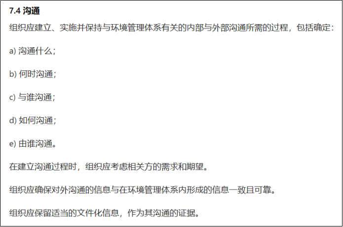 6、7.4沟通进行了重新修订,将“信息交流”更改为“沟通”,更加强调“相关方的需求和期望”,同时要求保留适当的文件化信息作为其沟通的证据。(2015年版为“适当时”,所以,由旧版的可选性变更为新版的强制性,必须披露相关环境信息。