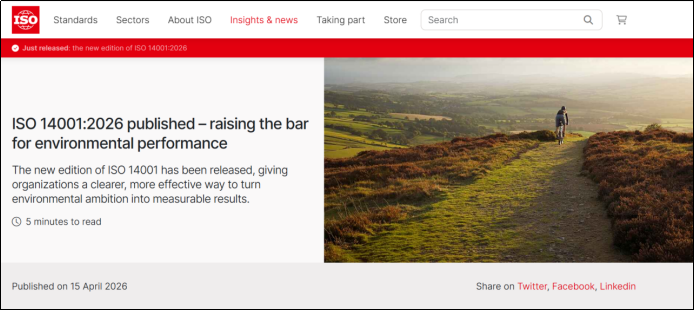 2026年4月15日,ISO官网发布了新版 ISO 14001 标准,将替代2015年旧版,对于新旧版本的要求,到底有哪些变化点?时隔10年变化,新版标准到底又有哪些进步?今天以最简单直白的文字与大家分享交流。