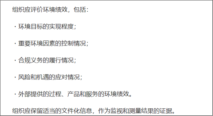 明确要求应该评价的环境绩效应该包括:环境目标、重要环境因素控制情况、合规义务的履行情况、风险和机遇的应对情况、外部提供的环境绩效等。