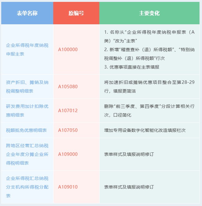 自2025年1月8日国家税务总局发布《关于优化企业所得税年度纳税申报表的公告》(2025年第1号)以来,2026年汇算清缴适用新版申报表,核心变化可概括为“取消2张”、“修订6张”。