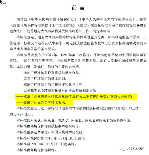 ——取消了总量控制区排放总量限值及有关卫生防护距离等计算的相关内容;
