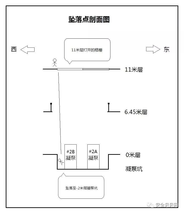 10:32至10:40期间,王某某一直在打电话联系班组技术员和班长,因手机信号不好,从6.5米走到11米运转层,未走安全通道,10:42直接走至2B凝泵侧吊物孔格栅打开的孔洞处,坠落至正下方-2米的凝泵坑内,落差为13米。