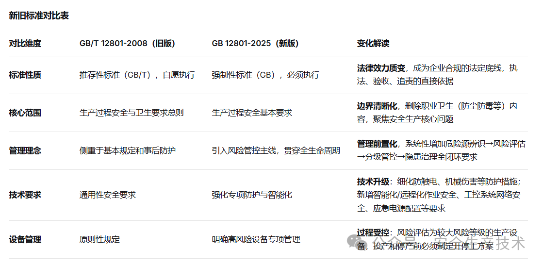 2025年12月31日,国家市场监督管理总局、国家标准化管理委员会正式发布了GB 12801-2025《生产过程安全基本要求》。这部标准将于2026年10月1日起强制实施,替代原有的推荐性标准GB/T 12801-2008。